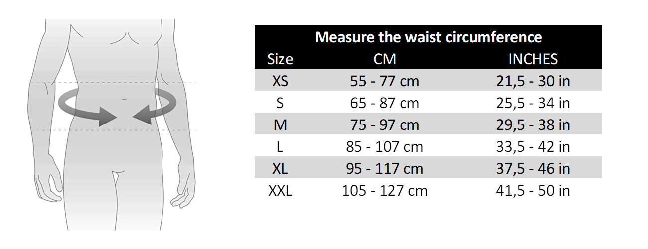 Meet je taille rond de navel zonder je buik in te trekken. Houd het meetlint strak tegen de huid. Kies de maat waarin jouw omtrek het meest centraal valt. Kledingmaten zijn geen betrouwbare indicatie.